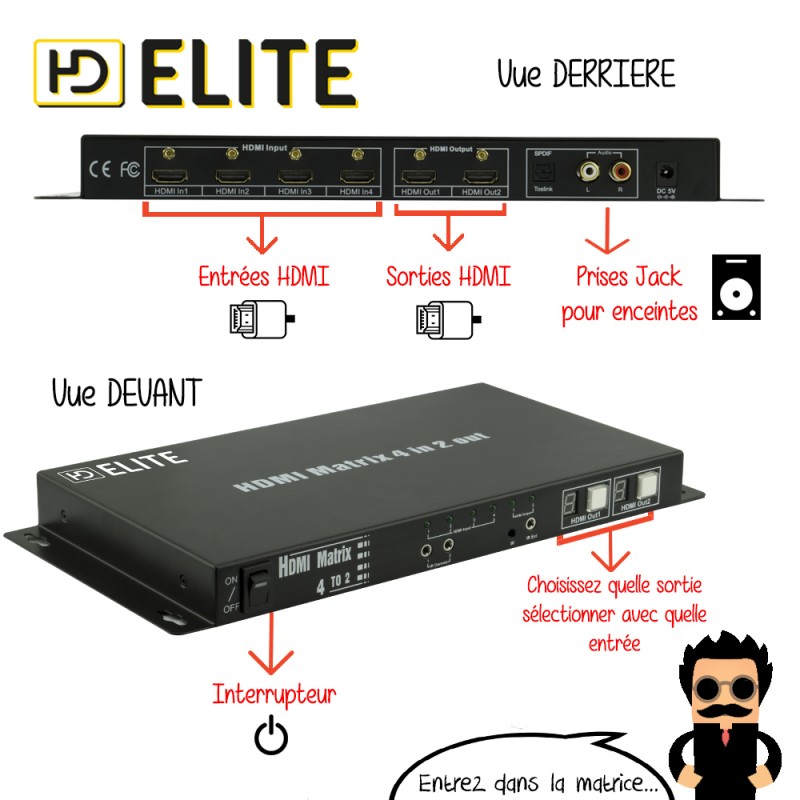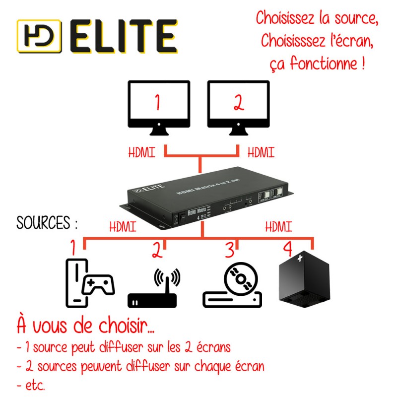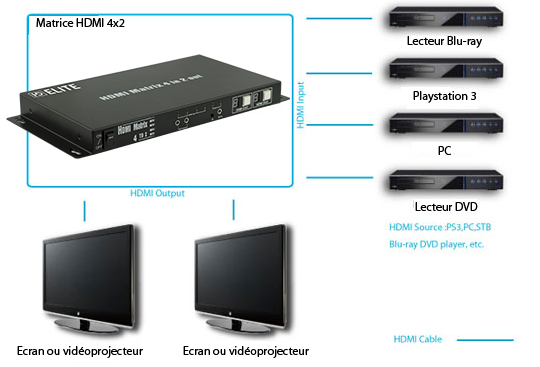 Cette matrice vous permet de diffuser une ou plusieurs sources HDMI différentes (exemple : votre lecteur Blu-Ray et votre ordinateur portable) vers plusieurs écrans distincts. Vous pourrez connecter jusqu'à 4 sources HDMI différentes sur 2 téléviseurs HD ou vidéoprojecteurs distincts.