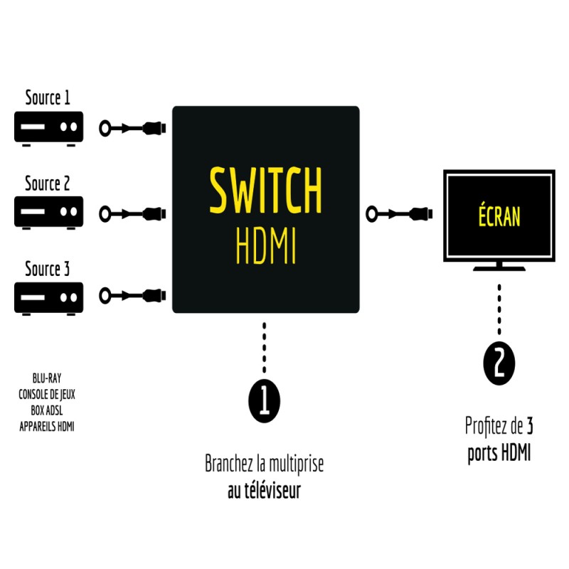 La multiprise switch 3 ports HDMI™ 4K/30Hz vous permet de connecter trois appareils HDMI sur une seule prise HDMI de votre téléviseur.