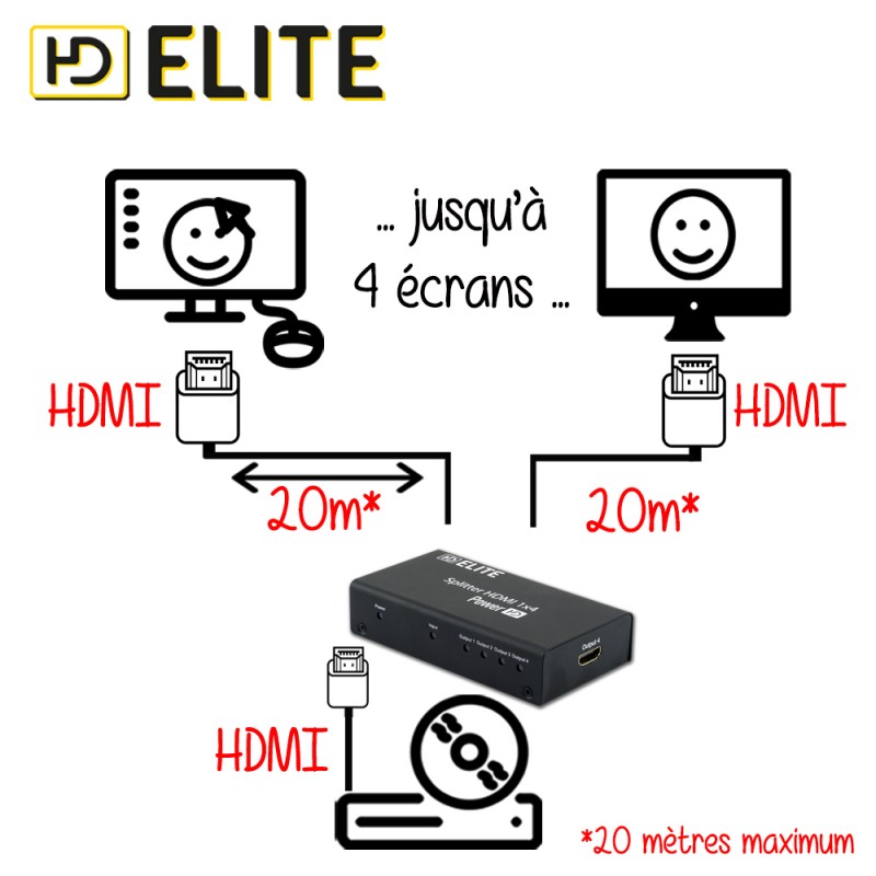 Les splitters PowerHD™ permettent de connecter facilement une seule source à plusieurs écrans sans perte de qualité. Avec ce splitter 4 ports, vous pouvez diffuser le même contenu (lecteur DVD, Blu-Ray, box, console de jeux vidéos…) sur 4 écrans simultanément.